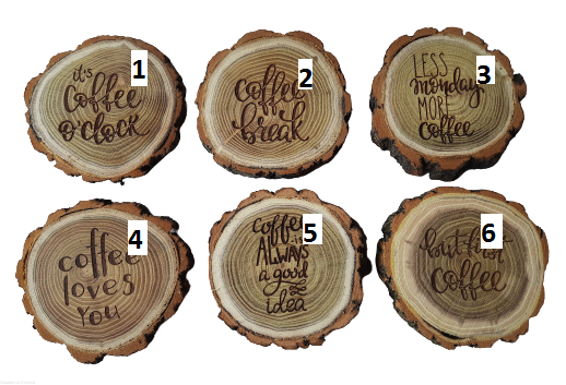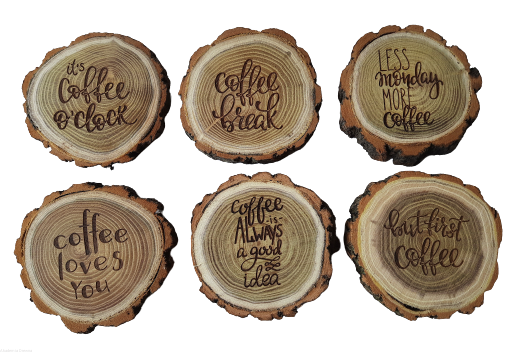 Podkładki mają wygrawerowane hasła związane z piciem kawy i relaksem - są doskonałe na prezent :)