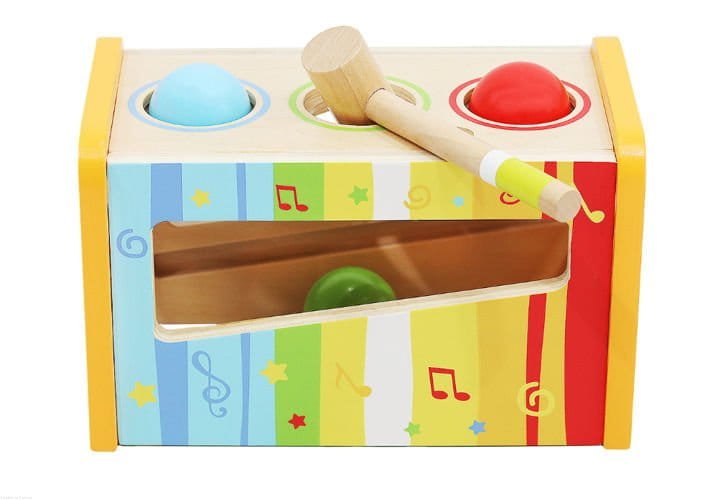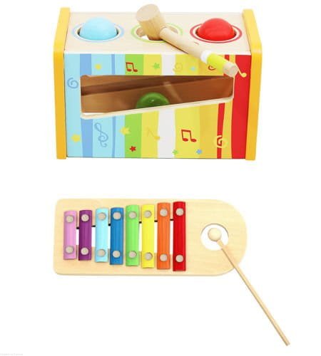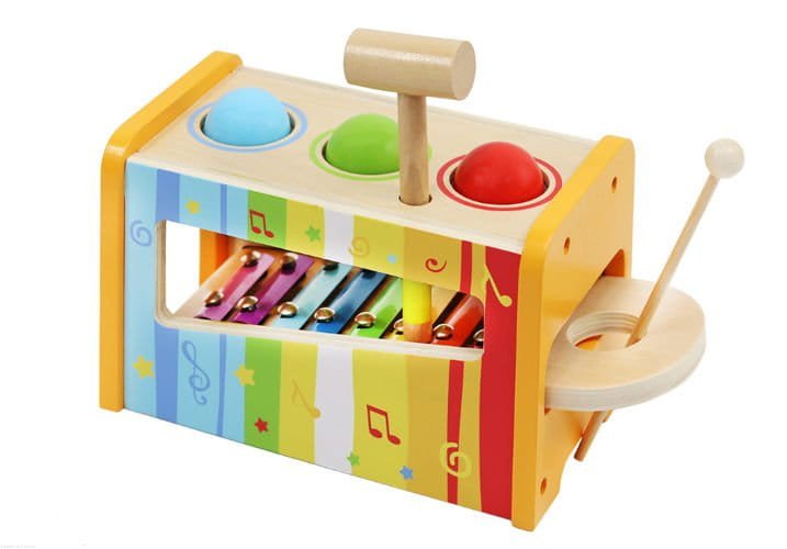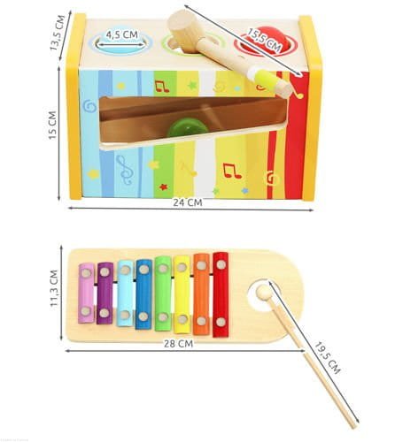 Cymbałki wraz z drewnianymi akcesoriami: pałeczką, młoteczkiem, 3 kulkami oraz obudową-schowkiem tworzą praktyczny komplet, który umożliwia wielofunkcyjne wykorzystanie. Ilość elementów w zestawie urozmaica i uatrakcyjnia zabawę.