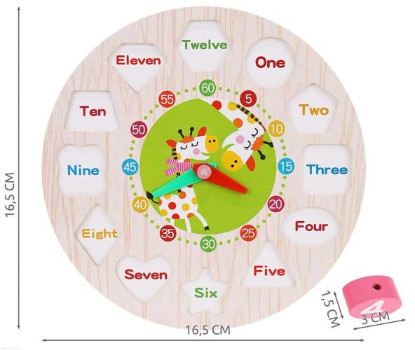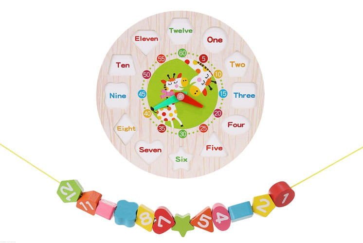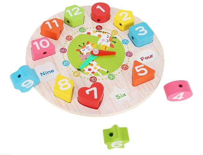 Układanka zegarowa, pozwala dzieciom zapoznać się z wyglądem tarczy zegara, jest również wstępem do poznania figur geometrycznych. Nawlekanie figur na sznurek jest doskonałym ćwiczeniem motoryki małej - która jest niezbędna w procesie prawidłowej mowy dziecka.