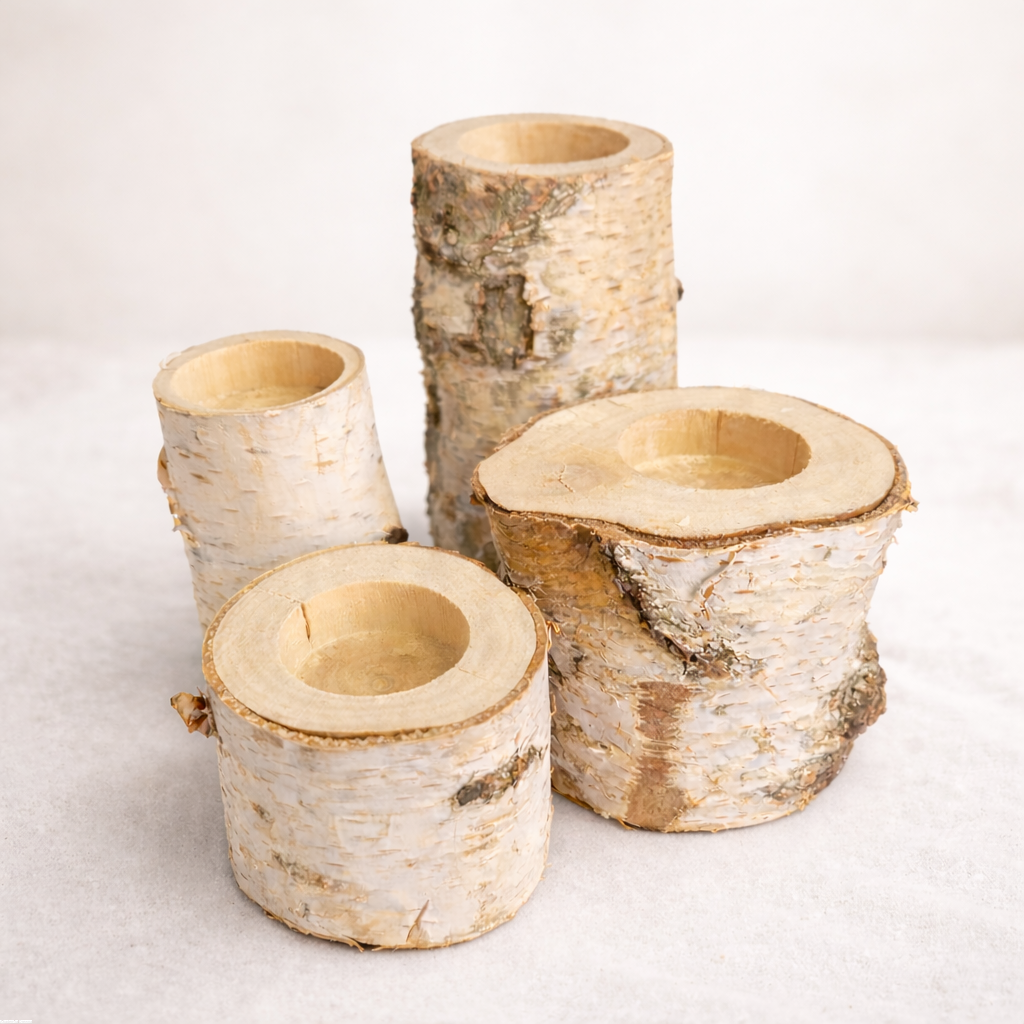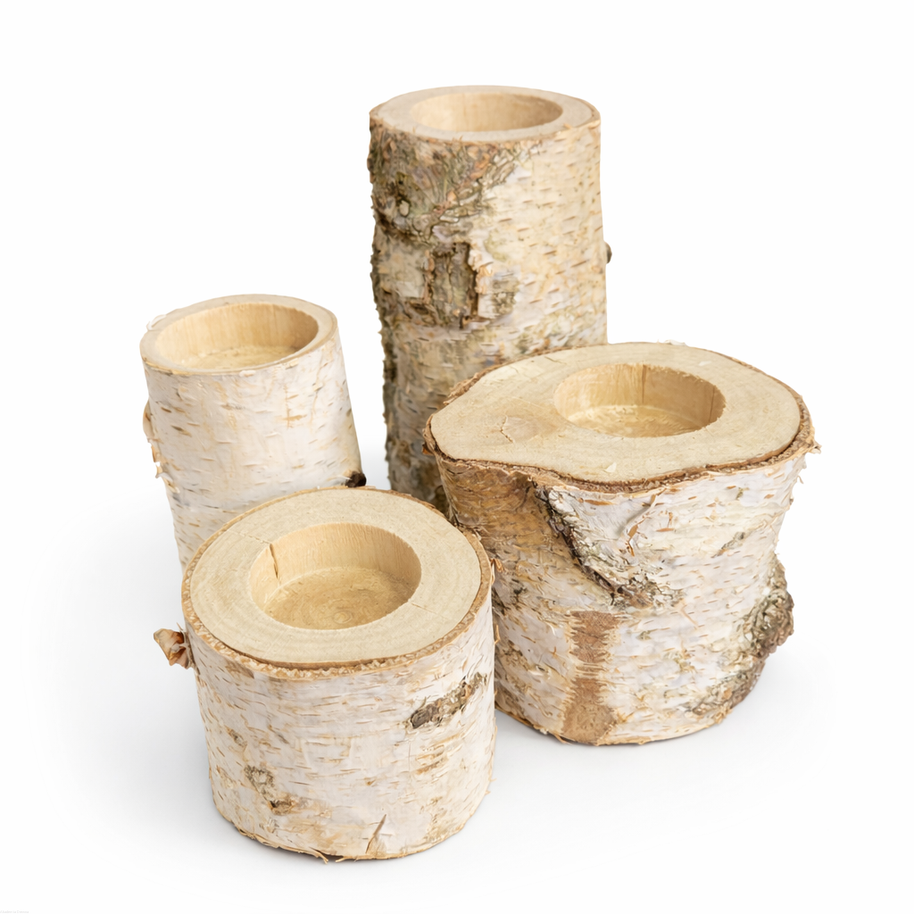Zestaw 4 świeczników brzozowych różne wysokości 4-12 cm
